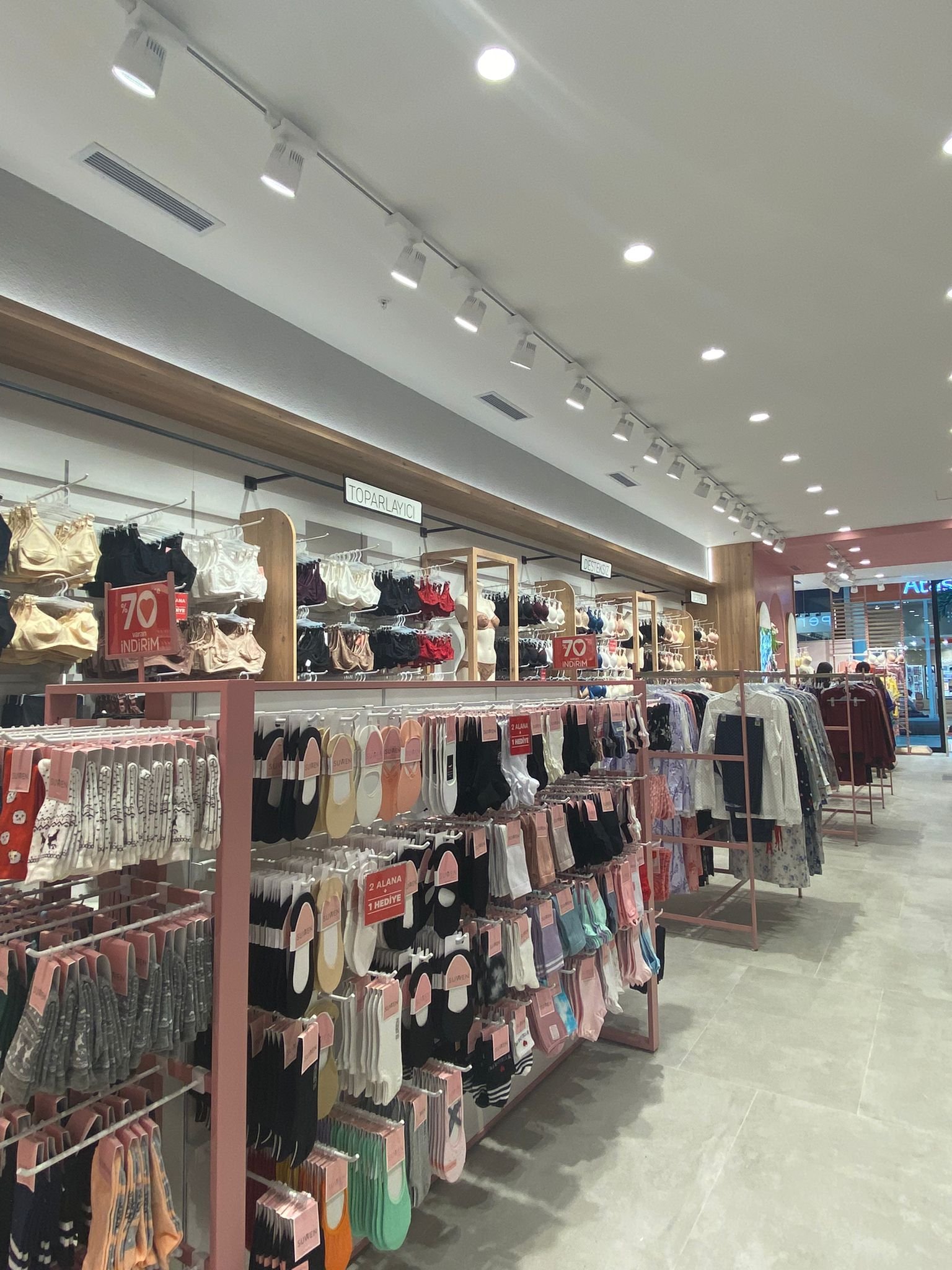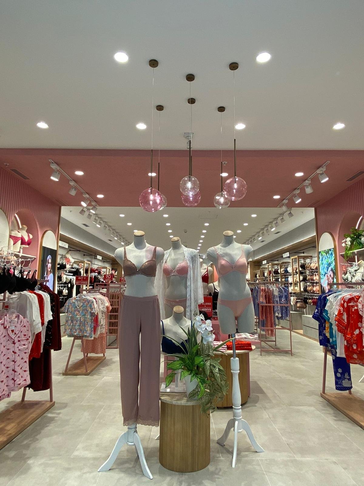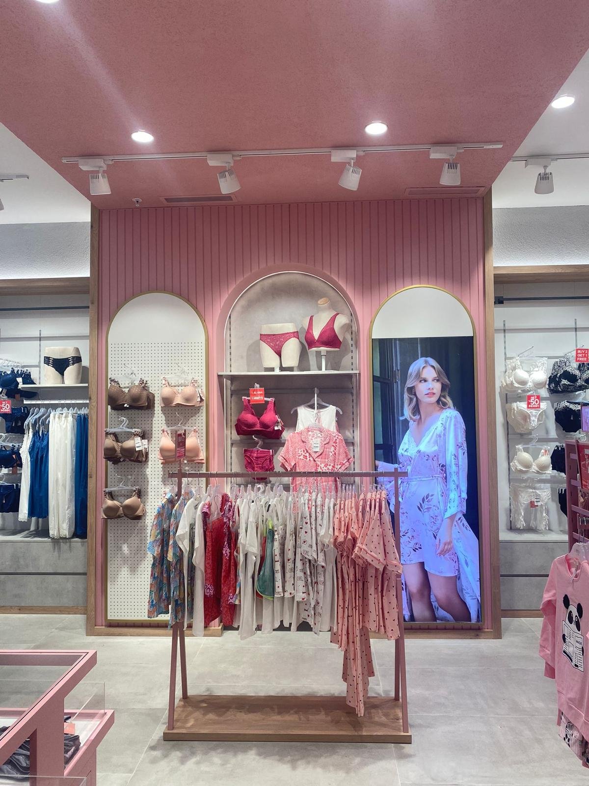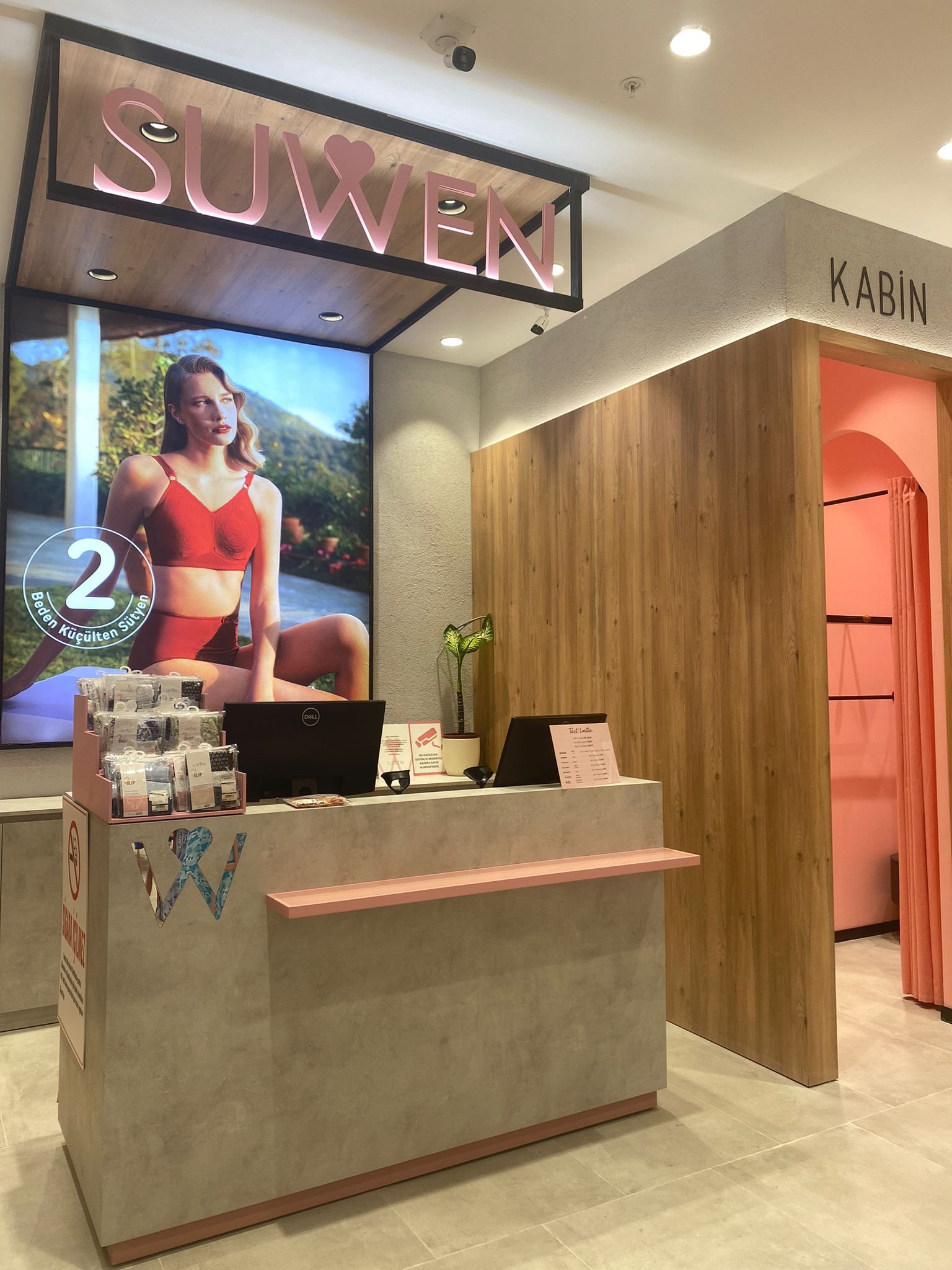 SUWEN mağaza projelerinde, iç giyim perakendesine uygun, ürünleri estetik ve düzenli şekilde sergileyen raf ve mağaza içi dekorasyon sistemleri tasarlanmıştır.