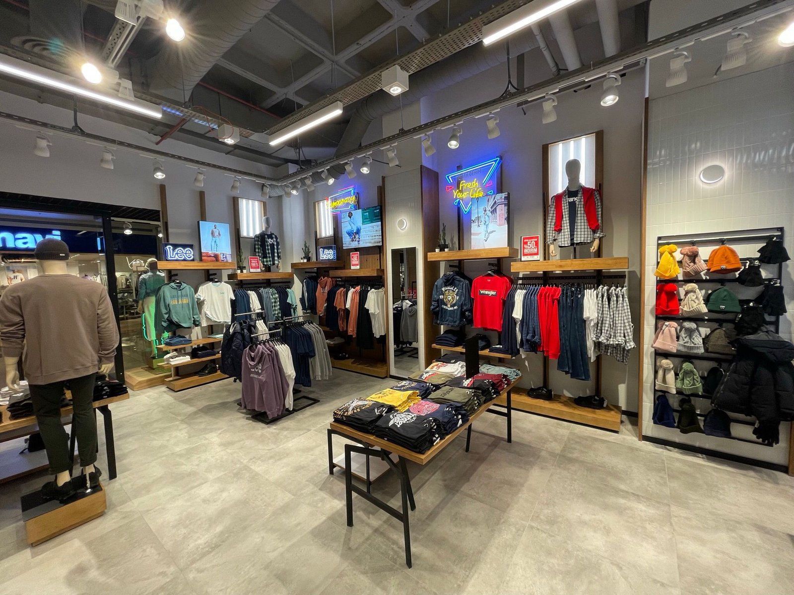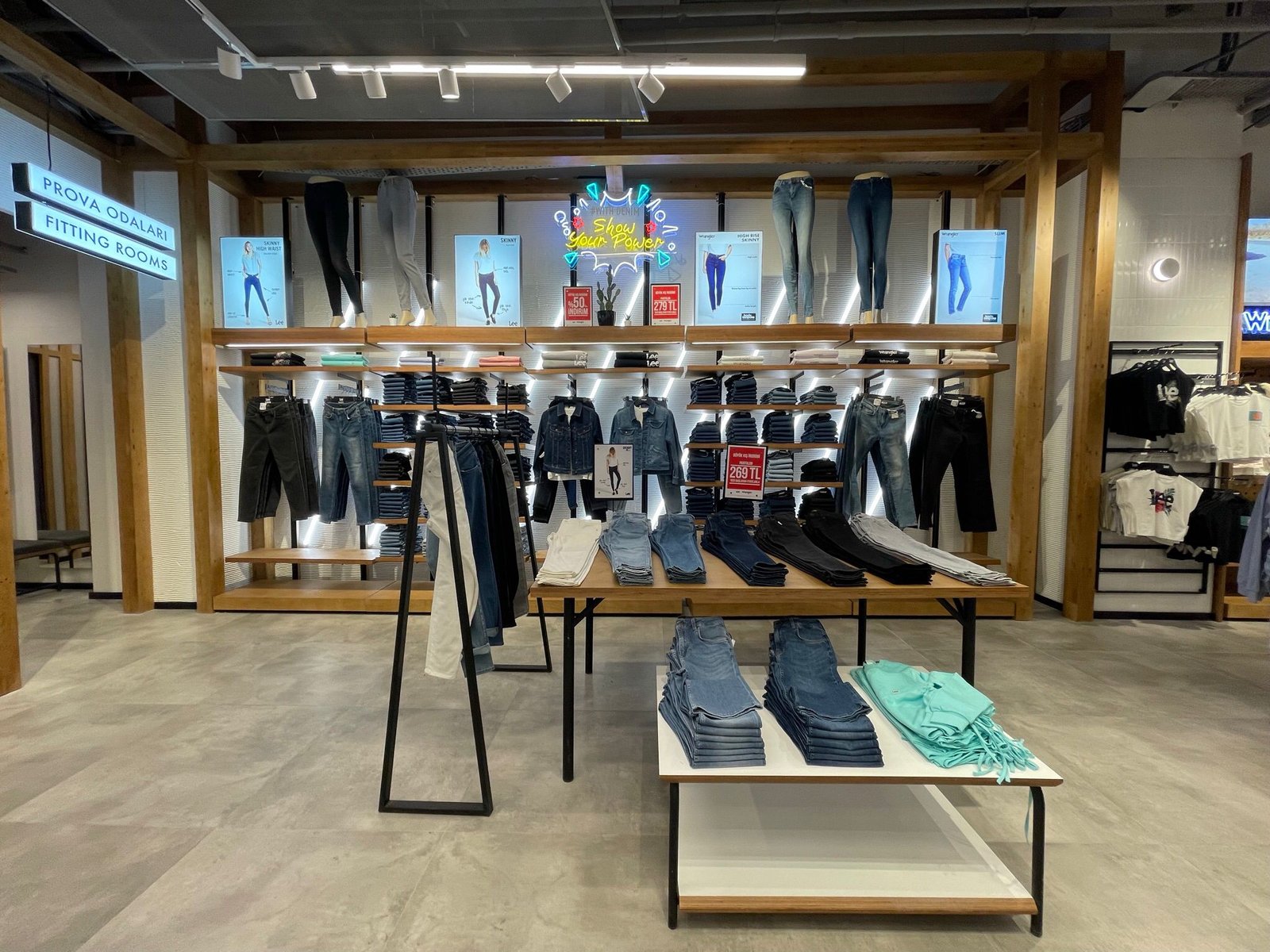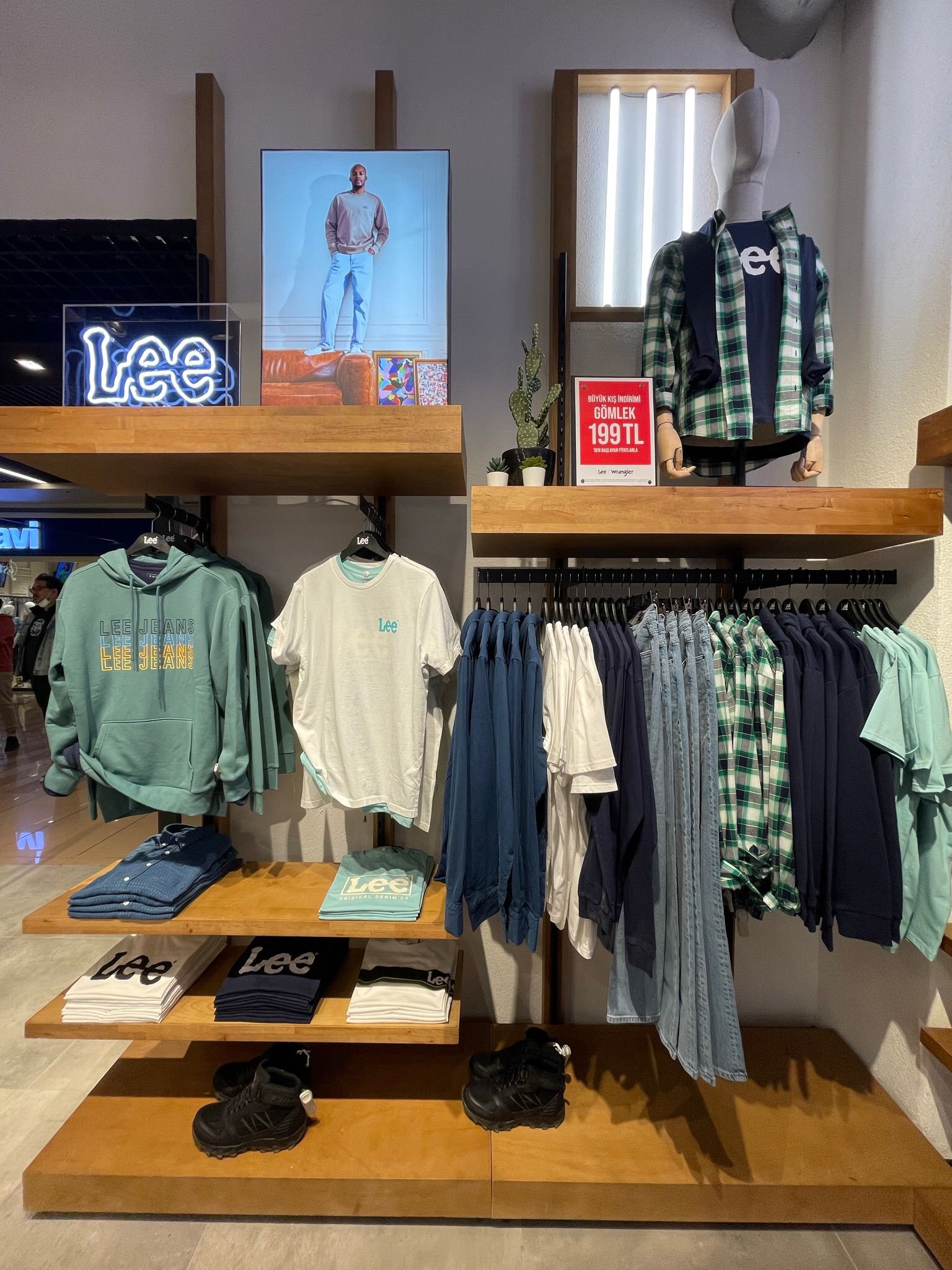 LEE mağaza projelerinde, denim ürünlerin sergilenme ihtiyaçlarına uygun, dayanıklı ve karakteristik raf sistemleri tasarlanmıştır.